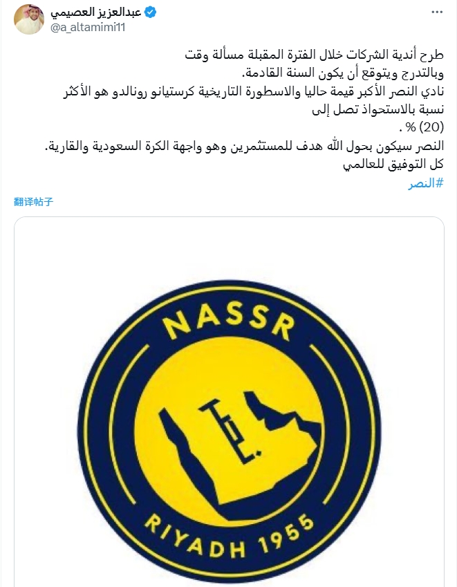 沙特记者:罗纳尔多目前拥有利雅得胜利的权益比例最高 达到20 发布时间:2025-10-06 11:16:00 | 浏览: 次 24 Live Network 8月1日,沙特记者Enterer Ellyaledi的记者报告说,罗纳尔多现在拥有利雅得胜利的20。 记者说,公司俱乐部的成立只是未来的时间问题,并且正在逐步进行,预计将在明年完成。 利雅得胜利目前是最有价值的俱乐部,罗纳尔多目前的股权比率最高,达到20。利雅得胜利将成为投资者的焦点,并成为沙特和亚洲足球的外墙。 标签: C罗 利雅得胜利